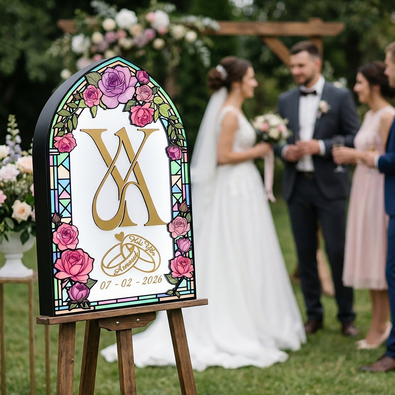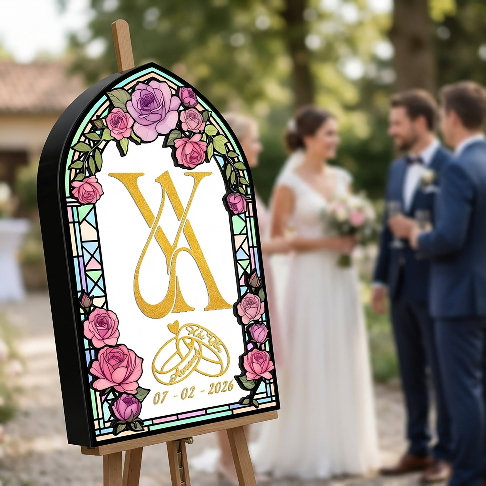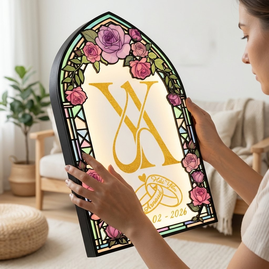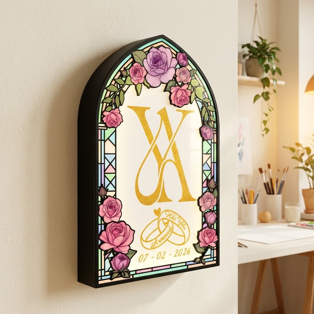 Create a romantic first impression with this Wedding Lighting Box, designed with elegant rose florals, a broken-glass stained effect, and a window-shaped frame personalized with the bride and groom’s names. Placed at the wedding entrance, it warmly welcomes guests while adding a timeless, artistic touch to your special day.